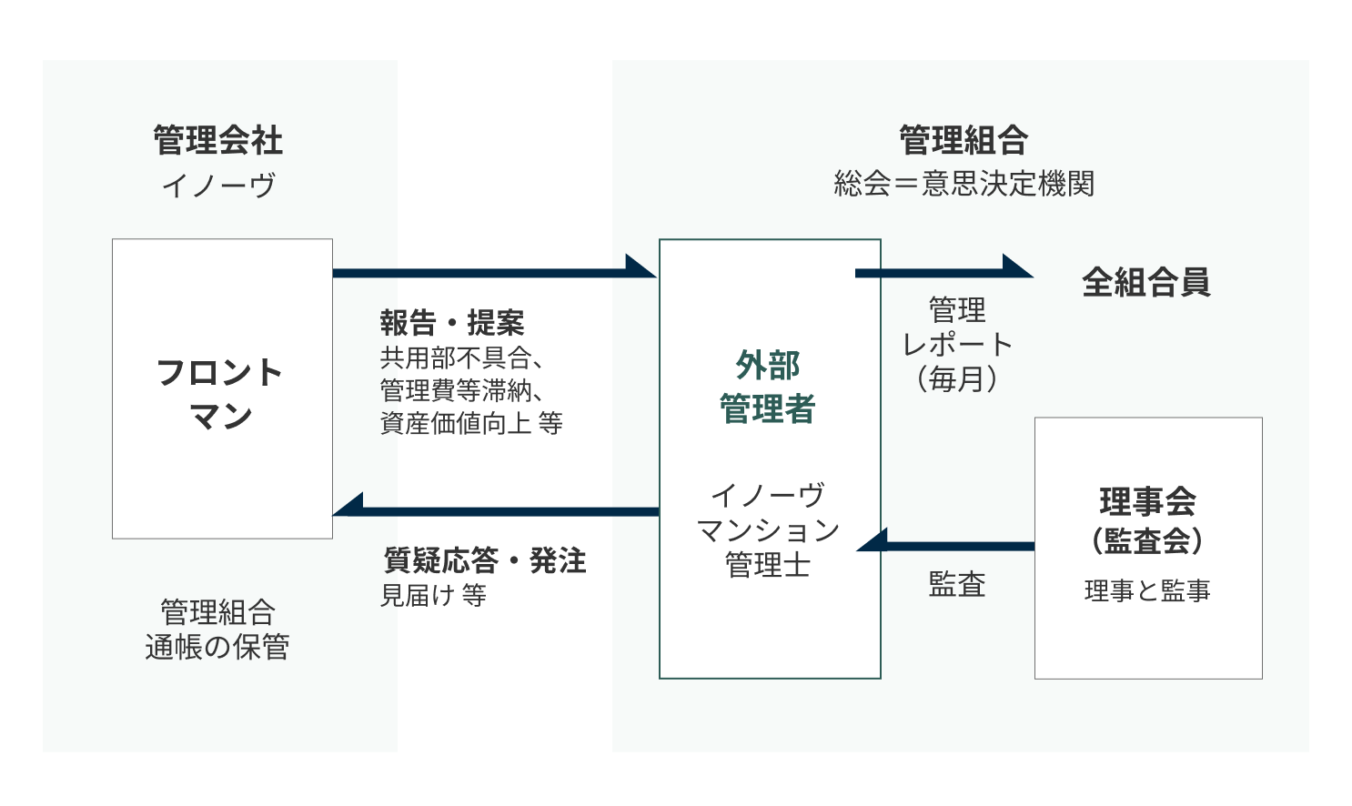 イノーヴの「外部管理者方式(第三者管理方式)」は、組合員の負担を軽減しつつ、 透明性を保持できるのが特徴です。